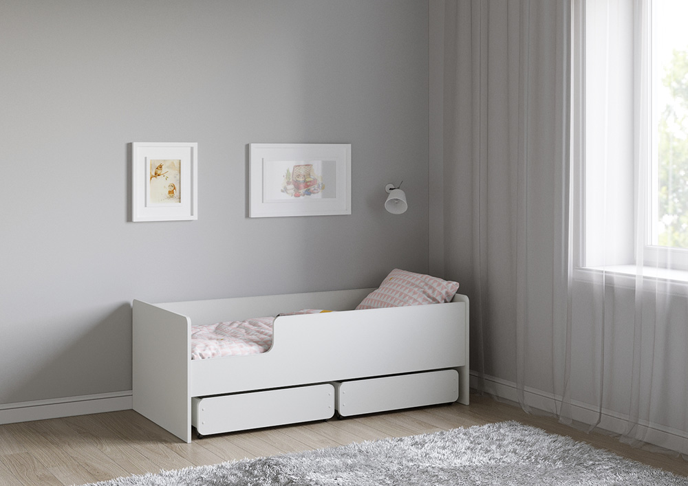 Кровать укомплектована 2-мя выдвижными ящиками, с прямоходными колесами.