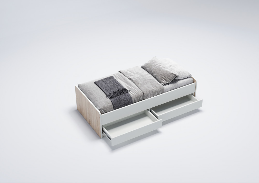 3. Практичные ящики: Кровать оснащена двумя выдвижными вместительными ящиками, которые оборудованы телескопическими направляющими с фиксаторами для легкого открытия и закрытия. Это предоставляет дополнительное место для хранения игрушек, одежды или постельного белья, что особенно удобно в ограниченном пространстве.
