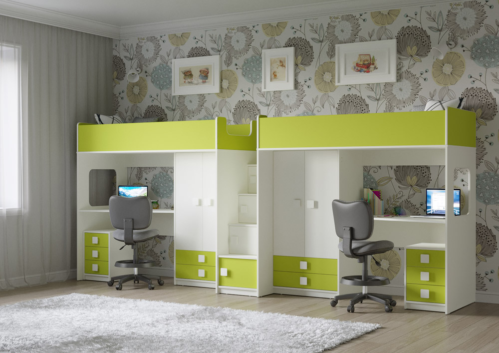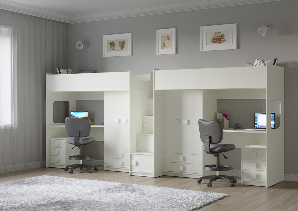 Две кровати, два шкафа, две рабочих зоны с тумбами – одна лестница. Идеальный вариант для двоих детей!