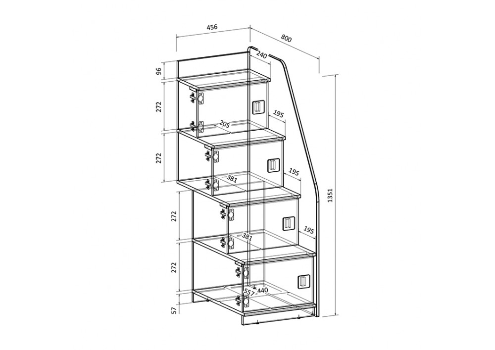 Угловая лестница-стеллаж из четырех ступенек надёжна и безопасна. Стеллаж состоит из четырёх полноценных полок с дверками - удобное дополнительное место для хранения вещей.