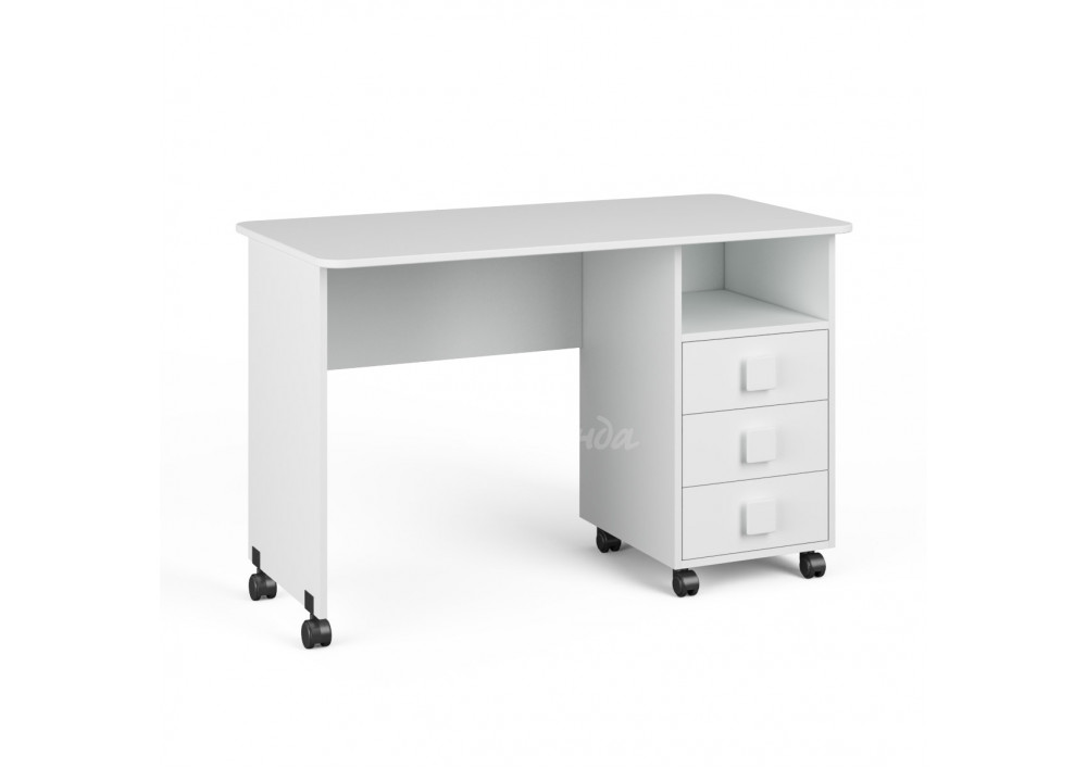 Комфортный письменный стол Л-03 белый оборудован поворотными колесами,легко перемещается по полу,задвигается и выдвигается.